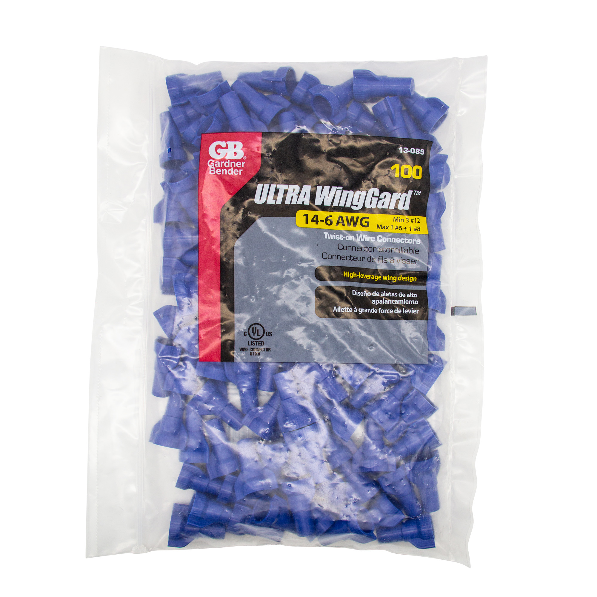 WHERE TO BUYGB's WingGard twist-on wire connectors offer unsurpassed quality and durability in a high-leverage, easy-on, wing-type design. These hardworking connectors offer a wide range of connection options essentially ensuring that one size can do the job of multiple standard connectors. The swept wings provide added turning torque and reduce the strain of multiple applications. The thermoplastic shell provides strength and resistance to chemicals while a long skirt prevents exposure of bare wire. The zinc-plated square wire-spring inside instantly adjusts to the shape and size of the splice upon insertion ensuring a long-lasting connection that resists corrosion and exceeds UL standards for dielectric strength and wire pullout force.