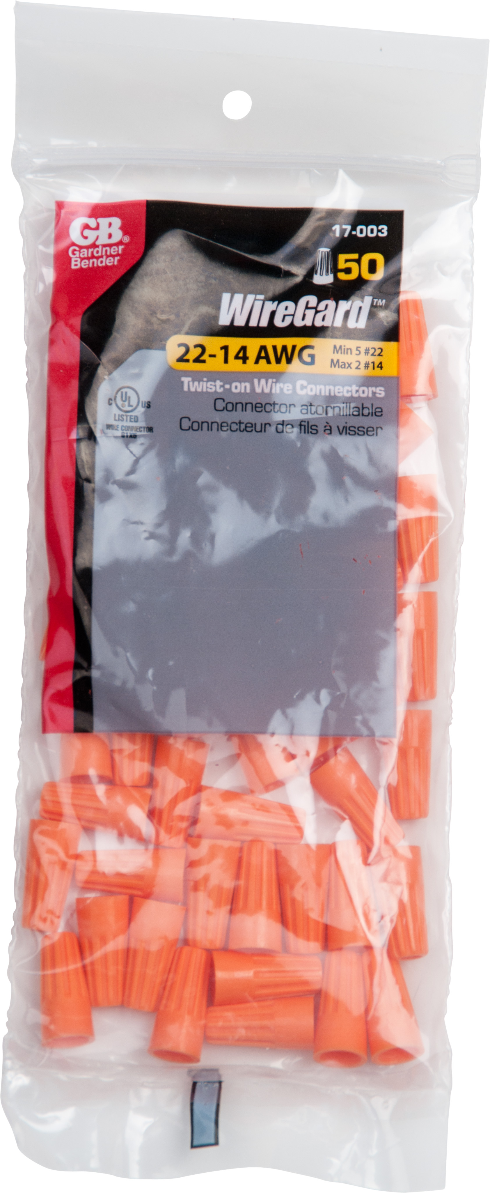 WHERE TO BUYWireGard twist-on wire connectors are designed for general purpose applications requiring the connection of 2 or more copper wires. WireGard connectors feature a straight type Polypropylene shell with side knurling for an easy grip. The inner spring is zinc-plated to resist corrosion and has a tight square profile to make quick secure contact with wires and ensure connections with positive continuity. These all purpose connectors require fewer turns to meet required torque and meet or exceed UL pull out and dielectric test requirements. The tough thermoplastic shell shields against environmental extremes and resists chemical action from hydrocarbons, diluted acid or alkaline solutions. The high-dielectric shell also features a deep skirt design to prevent exposure of bare wire. Flame-retardant properties resist heat distortion up to 105 C (221 F). Color coded for quick and easy size selection. Use for: Air conditioners, ceiling fans, doorbells, indoor lighting, switches, thermostats, ballasts, large and small appliances