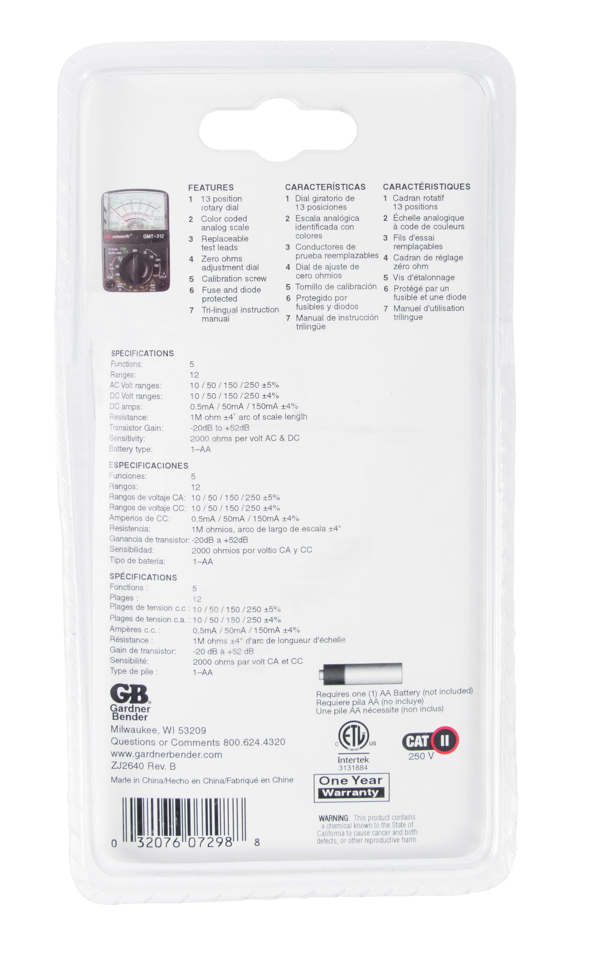 - Includes test lead input icons for correct lead placement and a set of positive and negative electrical test leads