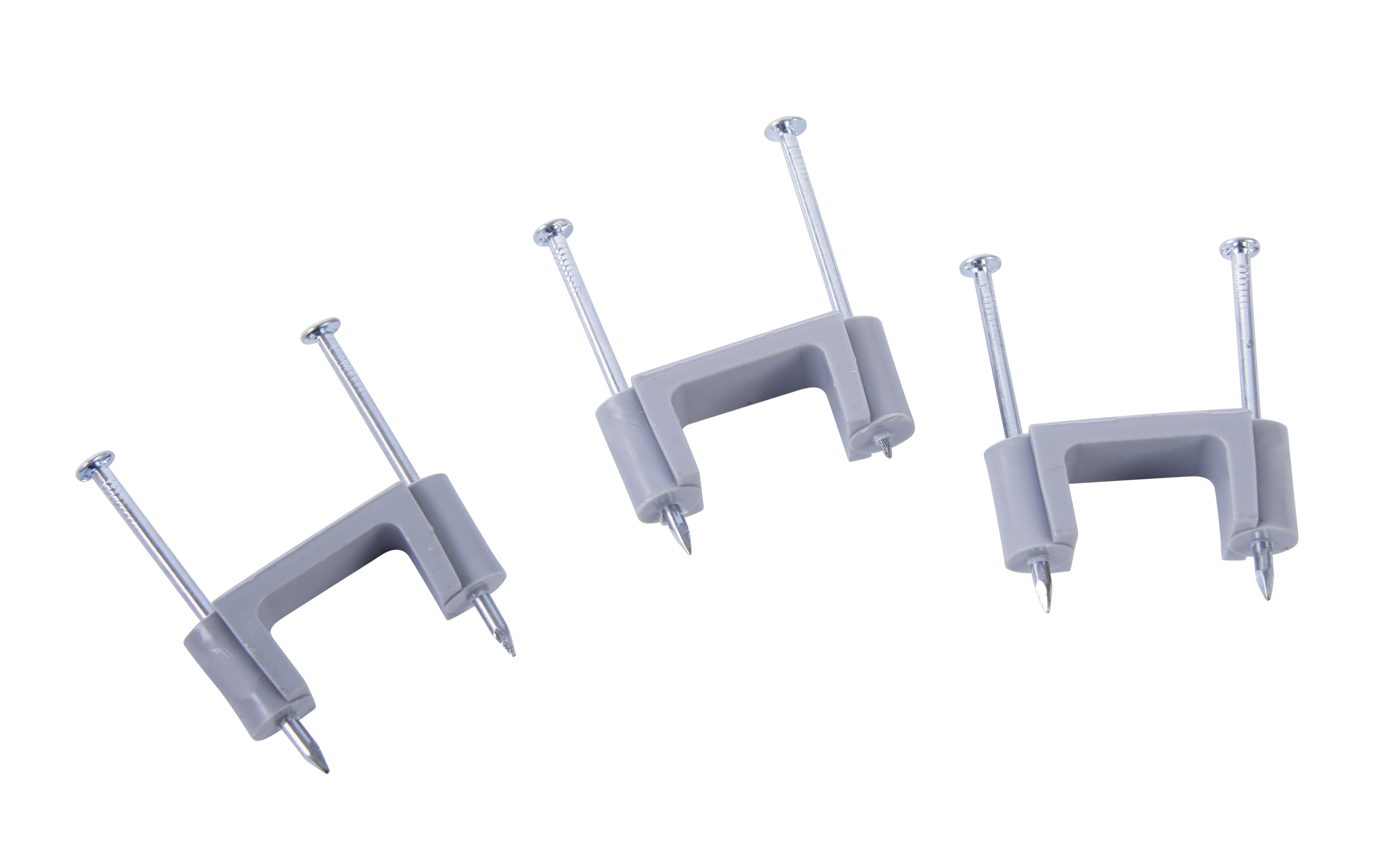 - INSTRUCCIONES: Coloque el cable en el lugar y la longitud deseados. Mantenga la grapa sobre el cable e instálela en la madera con un martillo.